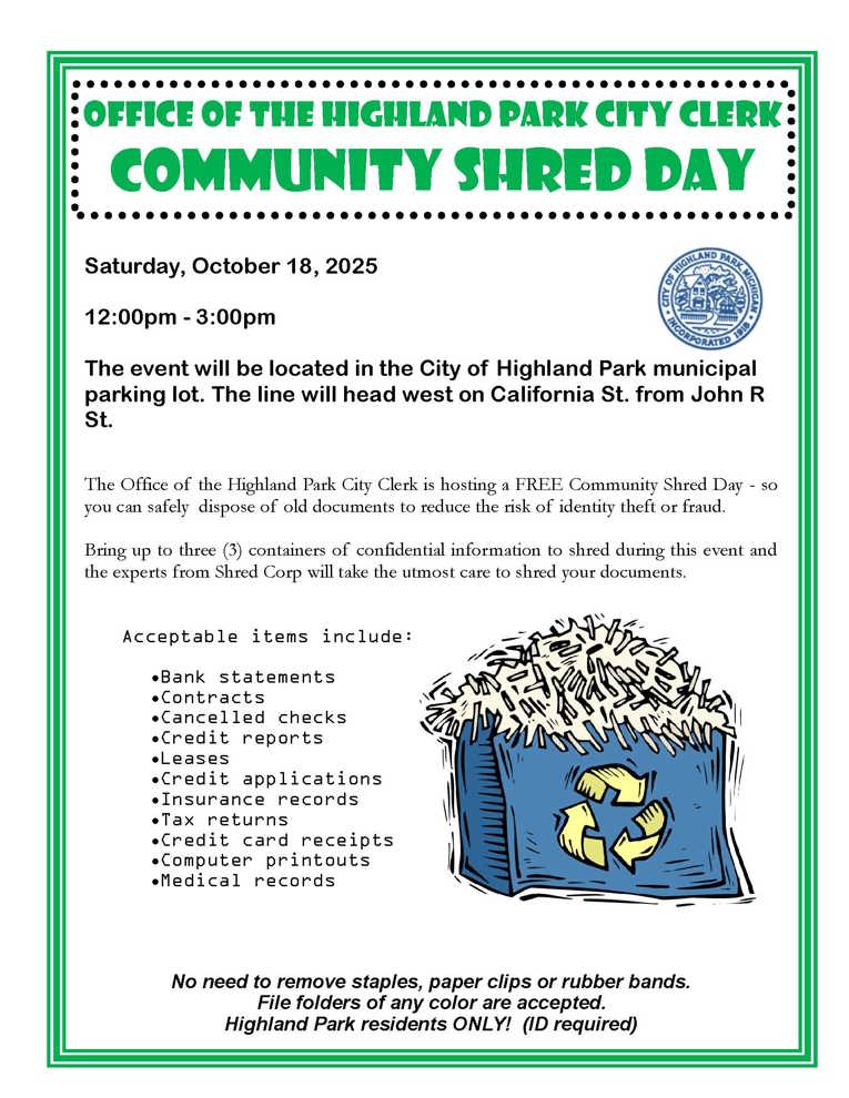 The Office of the Highland Park City Clerk is sponsoring a Community Shred Day for Highland Park residents only, Saturday, October 18, 2025, from 12:00pm - 3:00 pm.